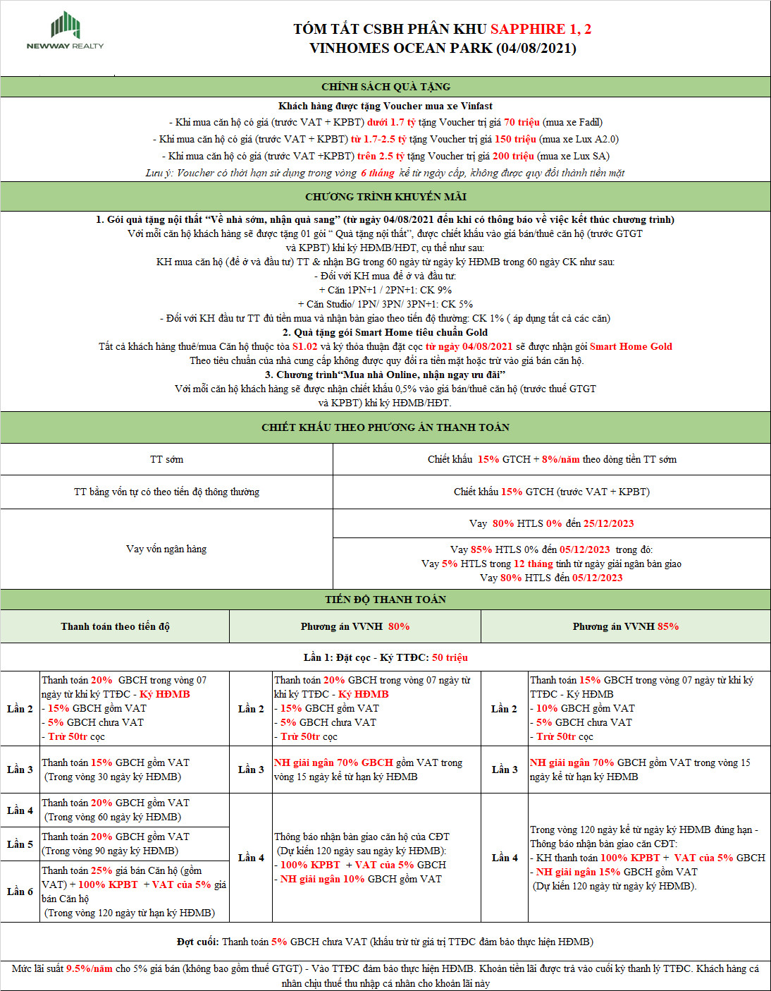 Chính sách bán hàng Sapphire 1,2 (Tháng 8/2021)