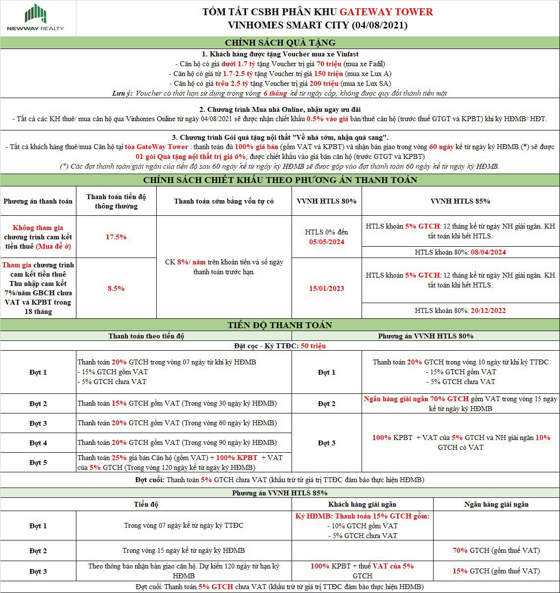 Chính sách bán hàng mới nhất dự án Gate Way – Vinhomes Smart City. Liên hệ Newway Realty để nhận thêm thông tin dự án Bất Động Sản Vinhomes: 0889.898.388 / 0909.842.139