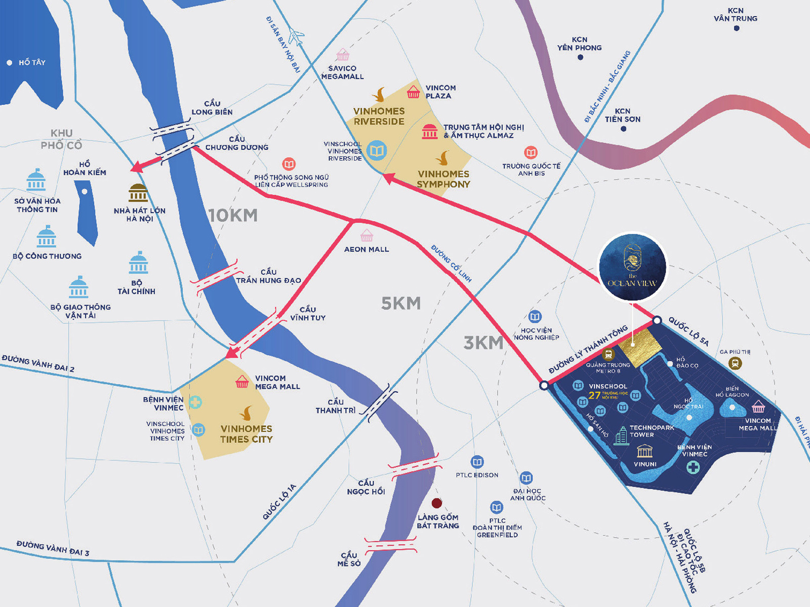 Bên cạnh đó, The Ocean View còn sở hữu vị trí kết nối ngôi sao và hưởng trọn hạ tầng giao thông đồng bộ của khu vực phía Đông. Nhờ đó, cư dân tiếp cận nhanh chóng đến các tỉnh thành trọng yếu lân cận như Hưng Yên – Hải Dương- Quảng Ninh – Bắc Ninh.